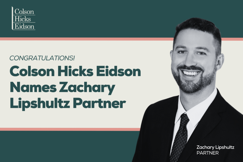 Colson Hicks Eidson is pleased to announce that Zachary Lipshultz has become a partner with the firm.