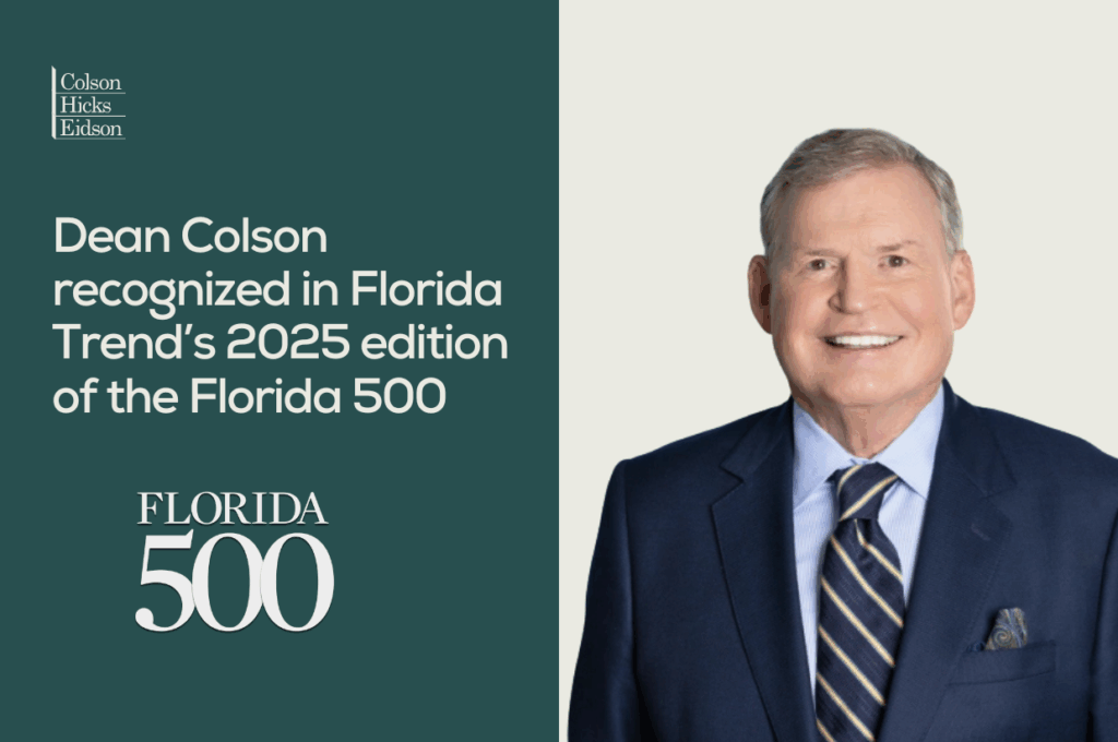 Colson Hicks Eidson is proud to share that Managing Partner Dean C. Colson has been recognized in Florida Trend’s 2025 edition of the Florida 500, which features the 500 most influential executives across various economic sectors in the state.